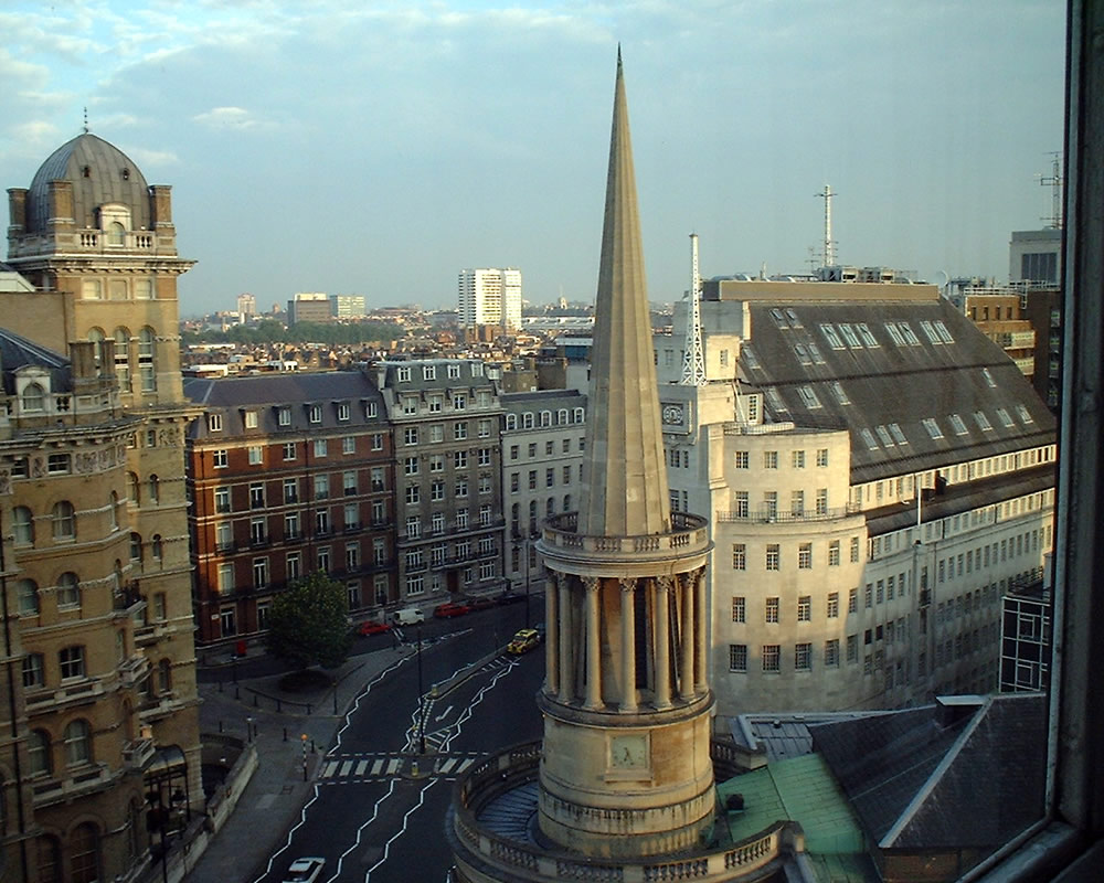ホテルの窓から恨めしそうにBBCを眺めてやるー・・・・・しかし夏の7時は明るいなあ・・・