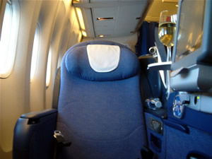 機内に入って、自分のシートナンバーへ行ってみると、あれ?これ違うぞ?・・・・ここって、ビジネスクラスじゃん。・・・・あれれ・・・間違ったかいな・・・・・戻って、エコノミーのほうに行ってみるが、全然番号が違う・・・・・・またビジネスクラスに戻ってくる・・・・・確かにこの番号だ・・・・・確かめたほうがいいのかなあ・・・・・・でも、チケットに書いてるんだし座っちゃえ!
