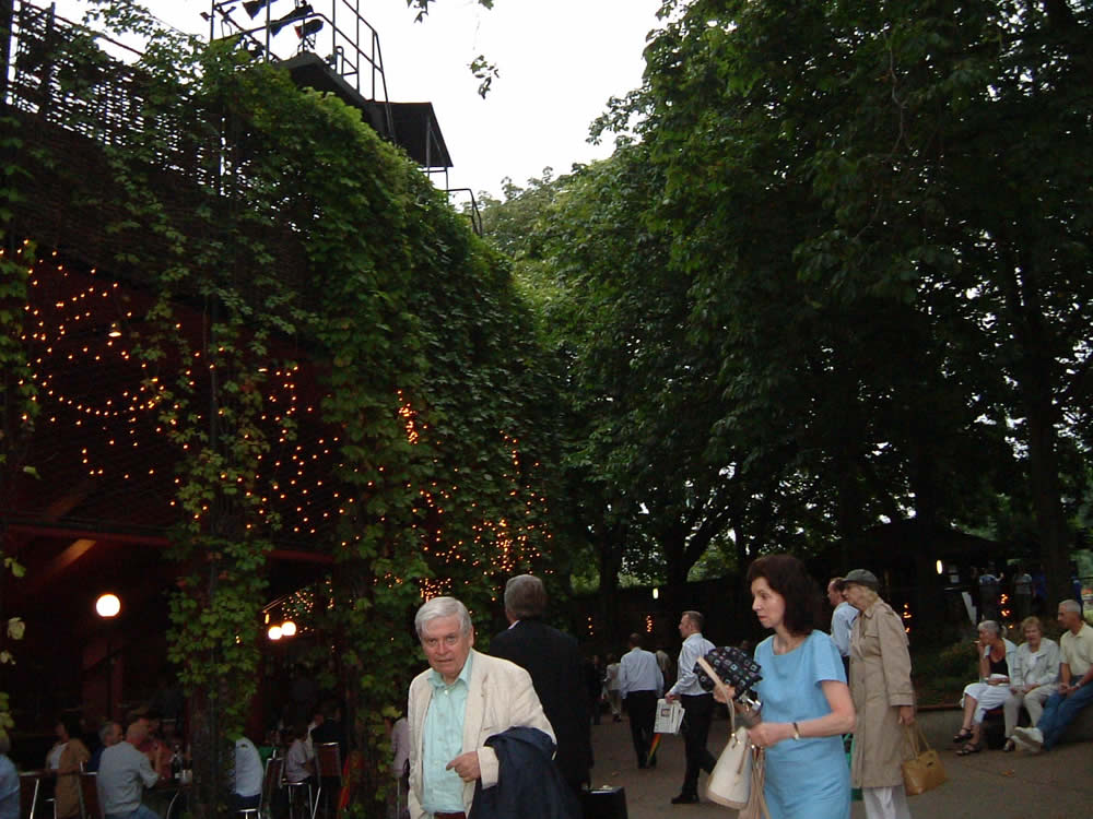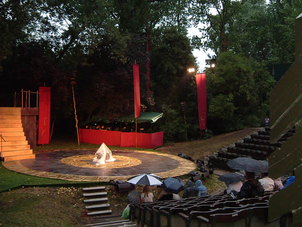 一応、傘は持ってきたのでさしてるけど、これって上演中は閉じるんだよなあ・・・・・後ろの人に迷惑みたいだし・・・・前列の英国人軍団は、そろってカッパを着てらっしゃる・・・・・・・・なかなかやるなあ・・・・カッパのほうが正解っす。傘なんてさしてても濡れるし・・・・