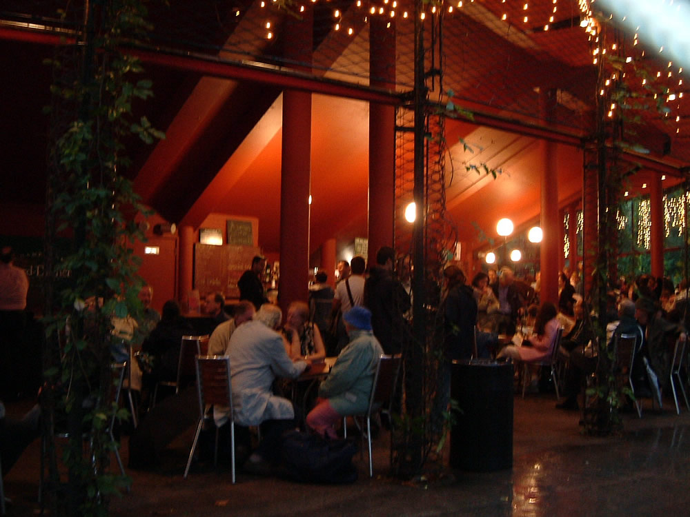 さっそく会場からいったん離れて、屋根付きのパブの方に移動した。あっという間に満席っすね。とくにもう飲みたくないので、パブ近くで雨宿りすることにした。