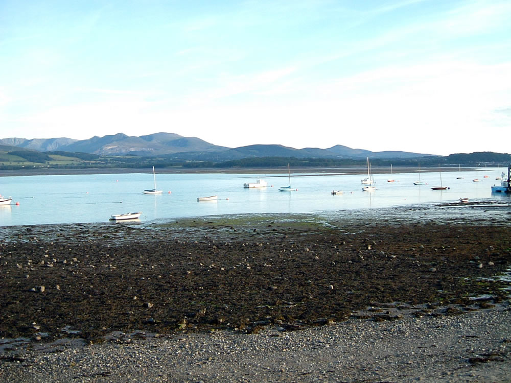 B: 向こうに見えるのがスノードニアの山岳地帯です。ちょっと見づらいですけど、たくさんのプレジャーボートが係留してます。