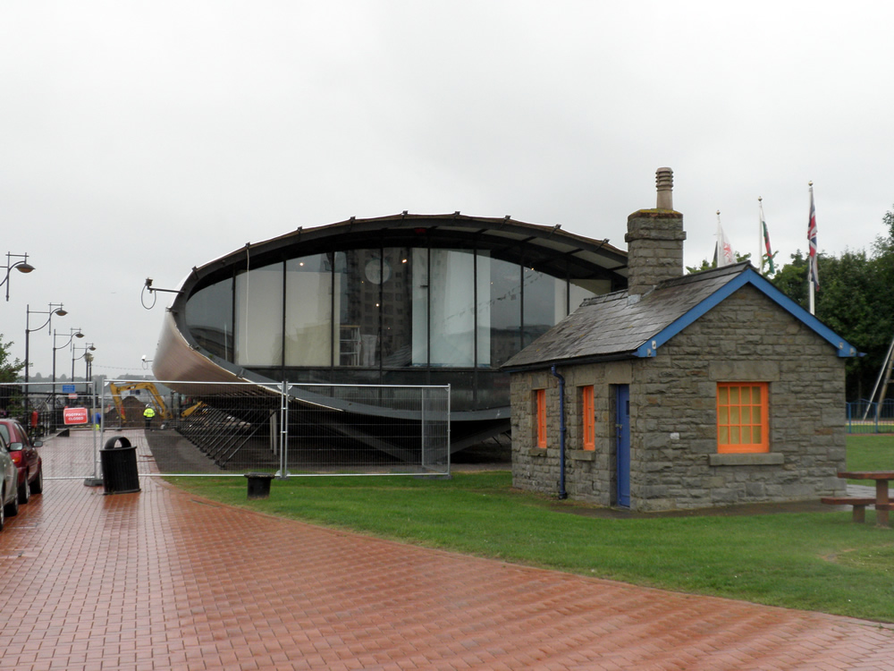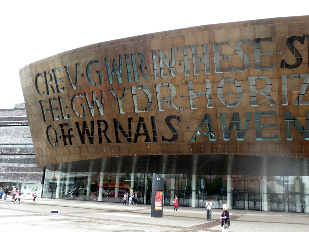 でも、建物の外側はなかなかインパクトあります。ウェールズ語で書かれているので、意味が全然わかりませんが、おおっ!と思う迫力はあるなあ・・・・・文字の部分はガラス窓になっているようです。