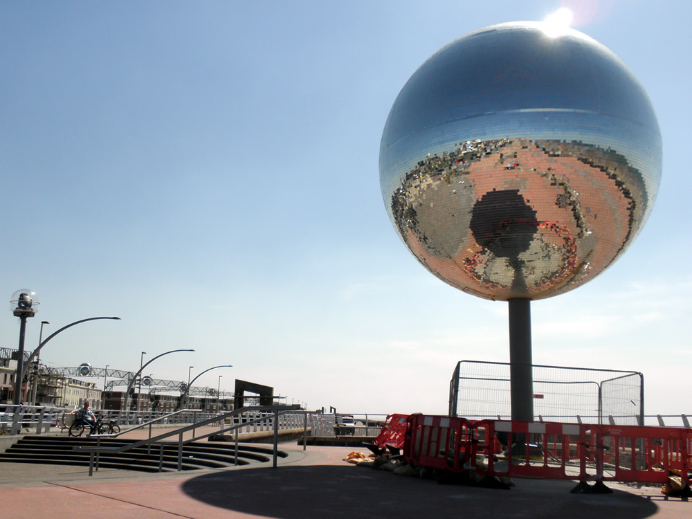 結構、端から端までだと距離があるわ。半端じゃないですな。ま、いくつか興味深いオブジェもありましたよ。写真のミラーボールみたいなものは、なかなかキレイです。回転はしていません。ちょっと老朽化してるんでしょうかね、近くはバリケードで立ち入り禁止になっておりましただ。